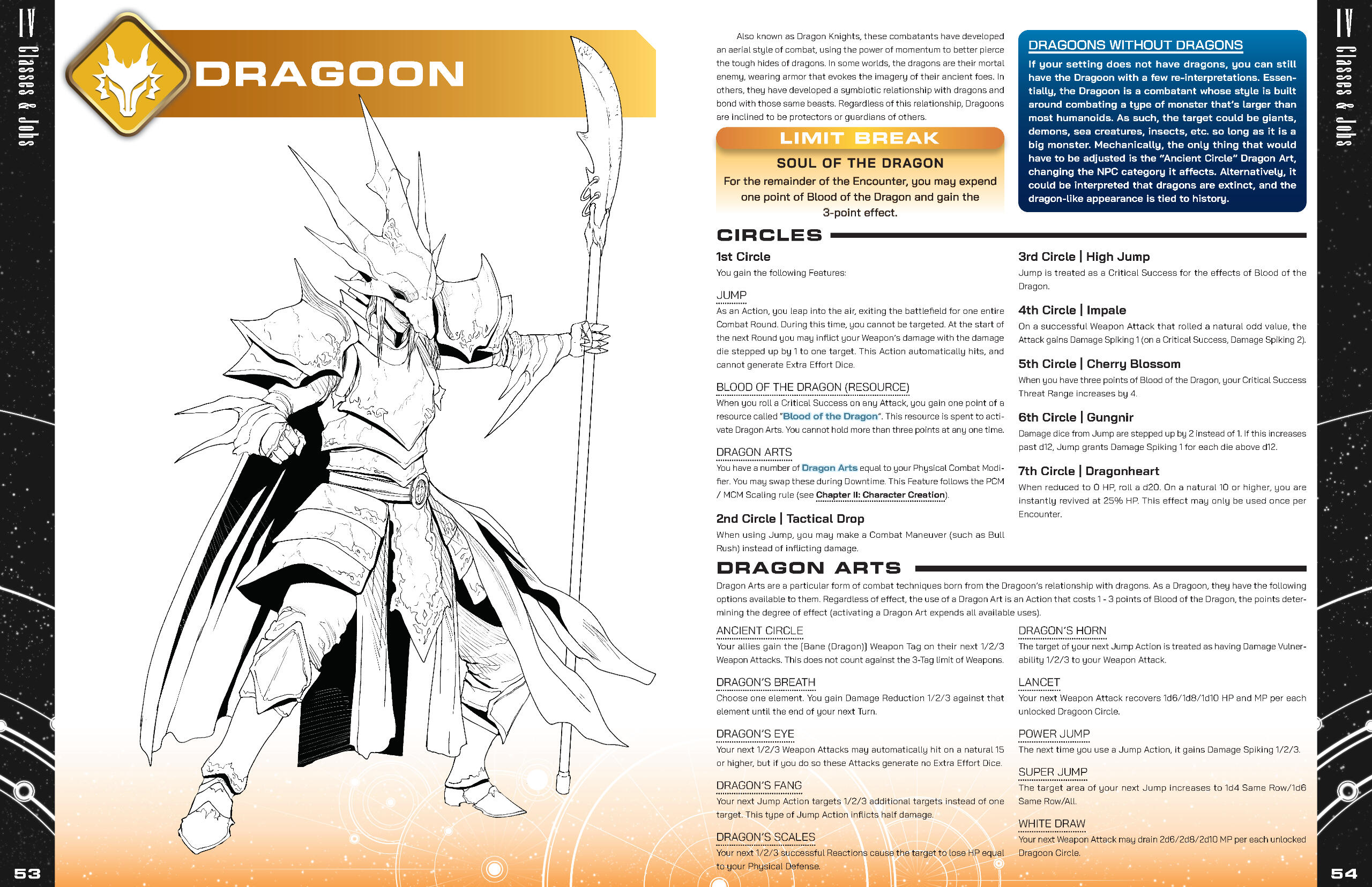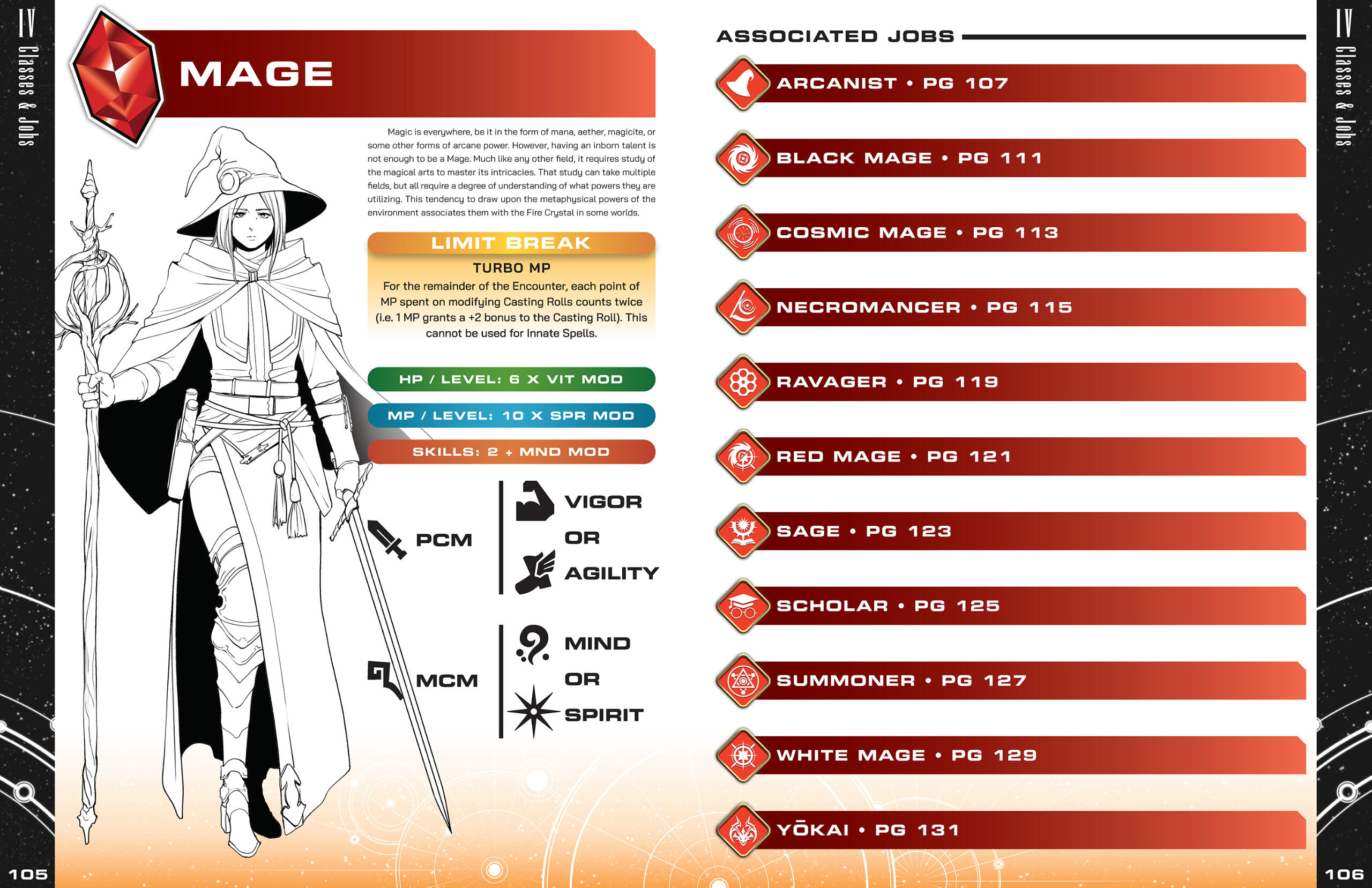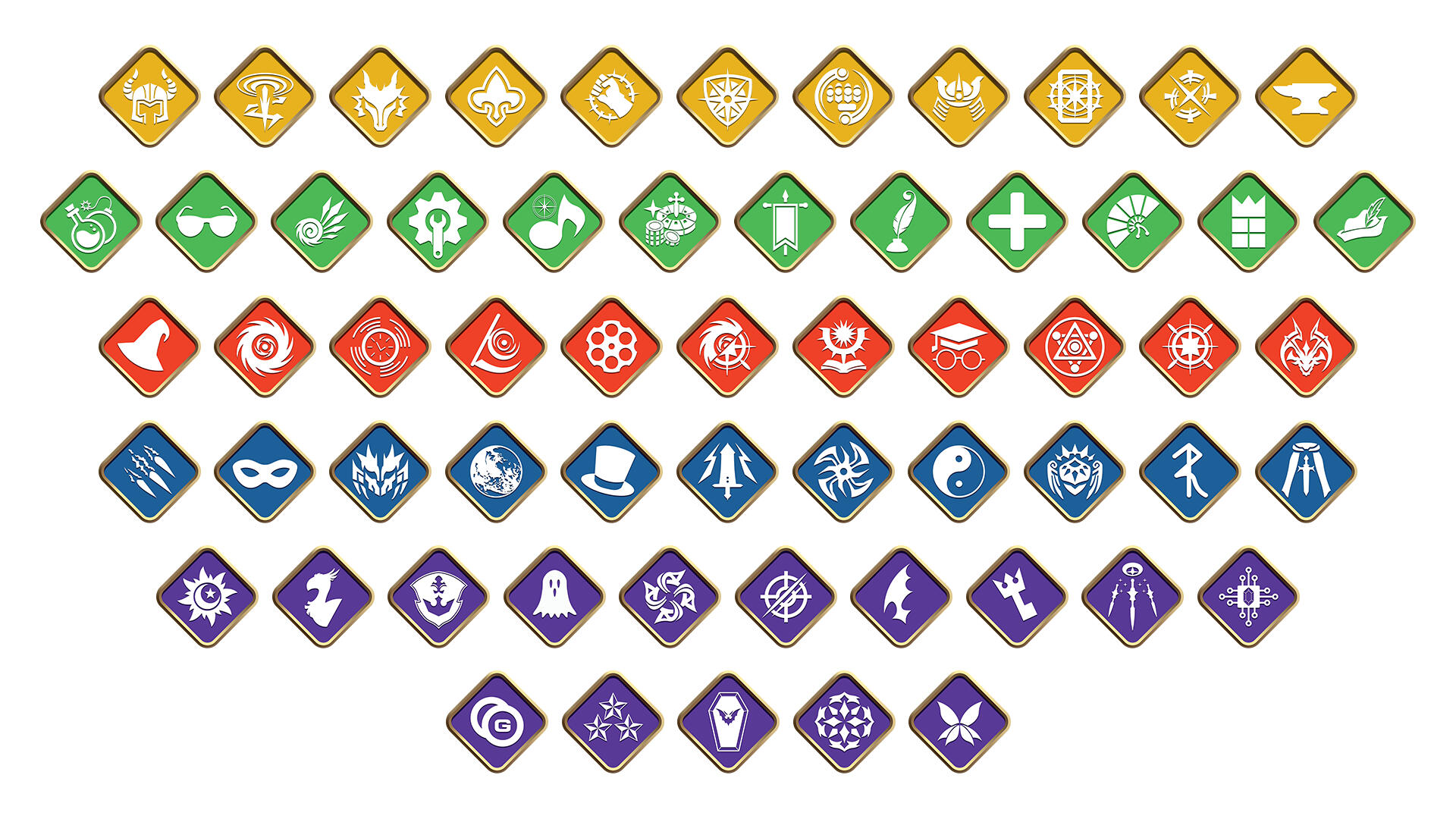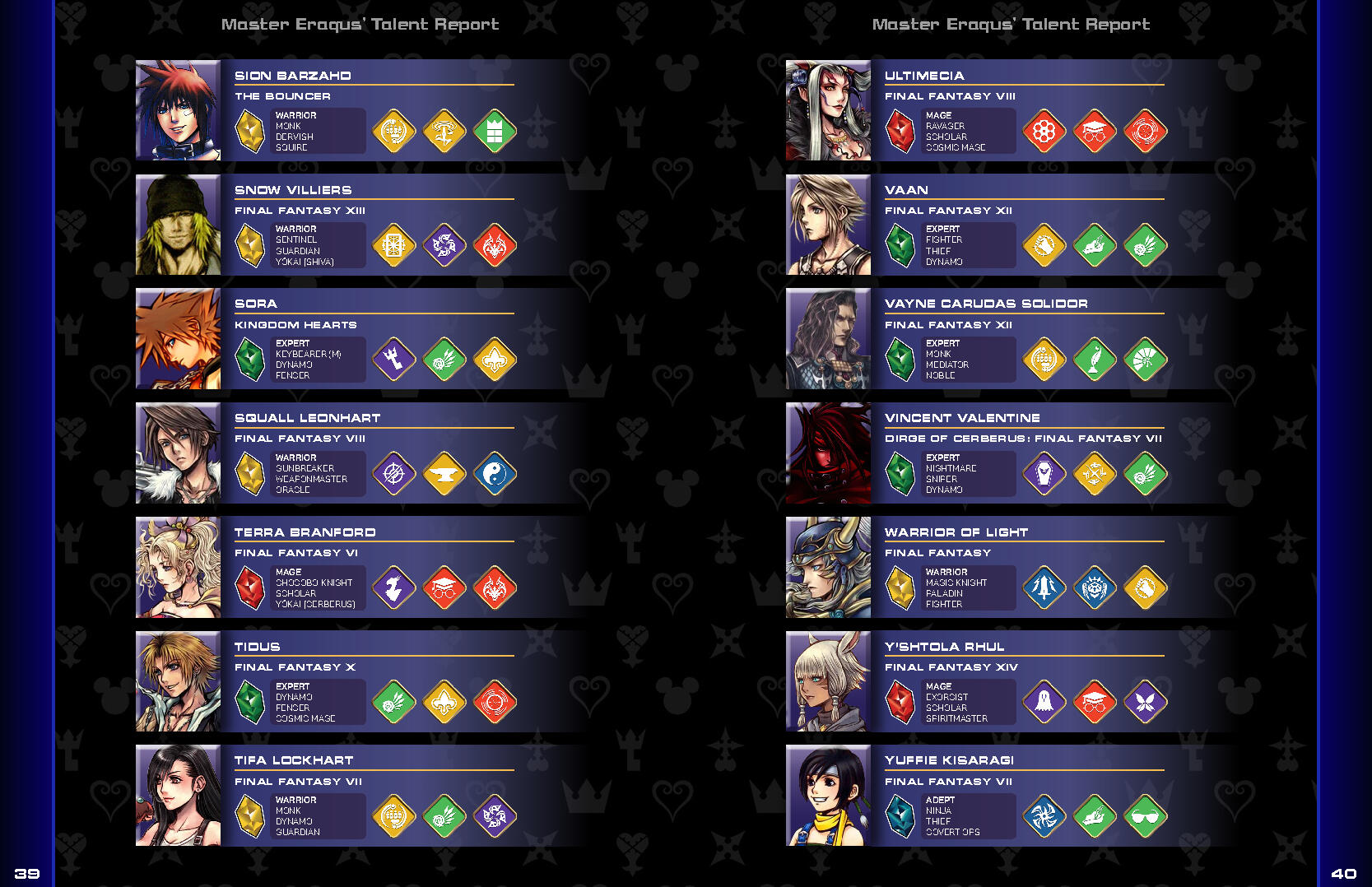 To supplement this bold art direction, I provided most of the icons that are used throughout the book. A majority of them are simply recreations of existing icons from various Final Fantasy titles, but due to Legend Edition's astronomical scope there were some extra niches that needed to be filled, and thus creative liberty was necessitated.One aspect that I offered of my own volition was the inclusion of unique icons to denote the various playable Jobs represented in the game. Job icons have only been utilized by a handful of official titles, namely Final Fantasy XIV Online and Stranger of Paradise: Final Fantasy Origin, the former of which featuring designs that are rooted in the game's lore. I wanted to implement a universal set of icons that could easily be applied to any setting, while still being recognizable on their own. The direction for these icons combines elements from the aforementioned titles, marrying the box design of XIV's emblems with the icon designs of Stranger of Paradise. As a result, many icons were lifted directly from Stranger of Paradise, with the remaining Jobs unique to Legend Edition taking heavy inspiration from that design style. Each color denotes the Class each set of Jobs is associated with (the sole exception being the purple icons, which are independent and do not have an associated Class).