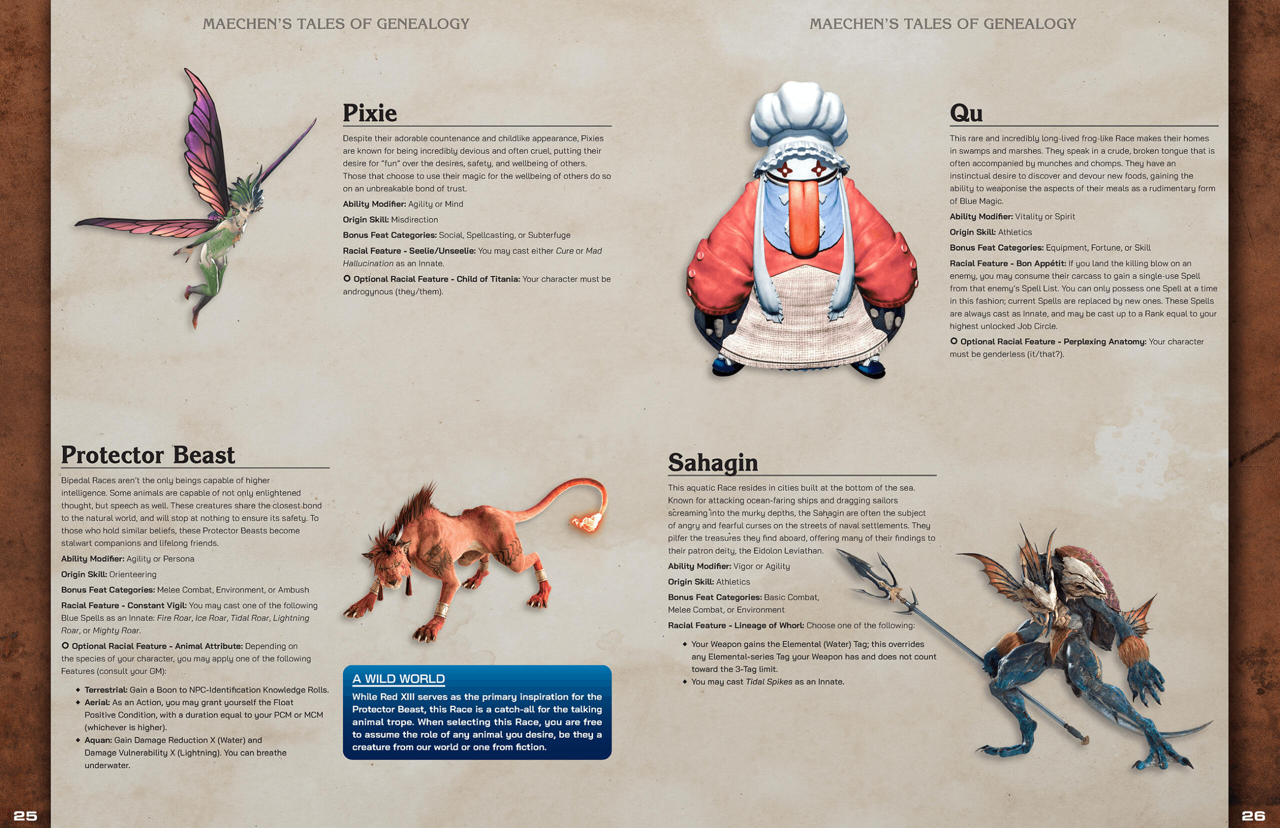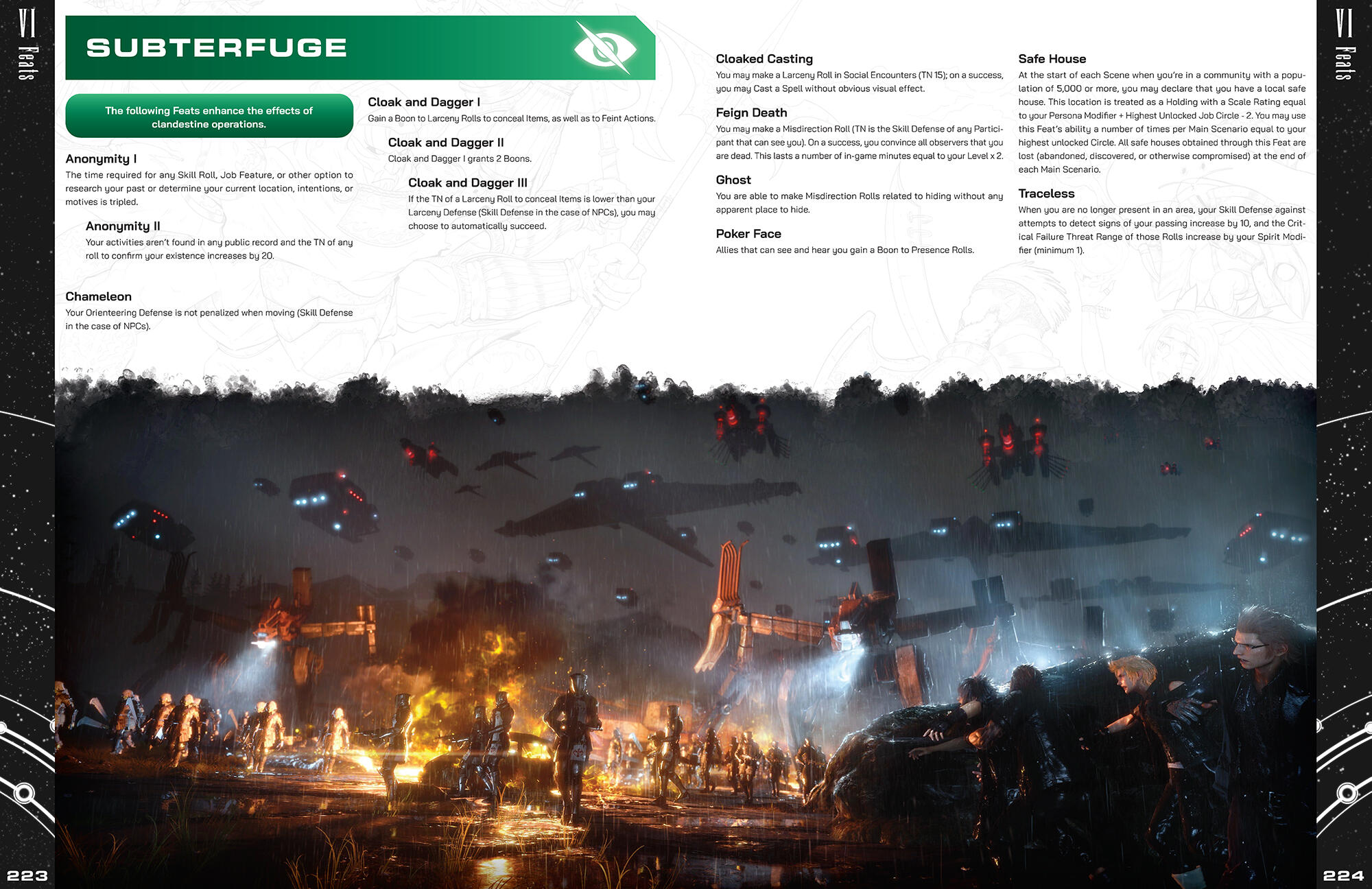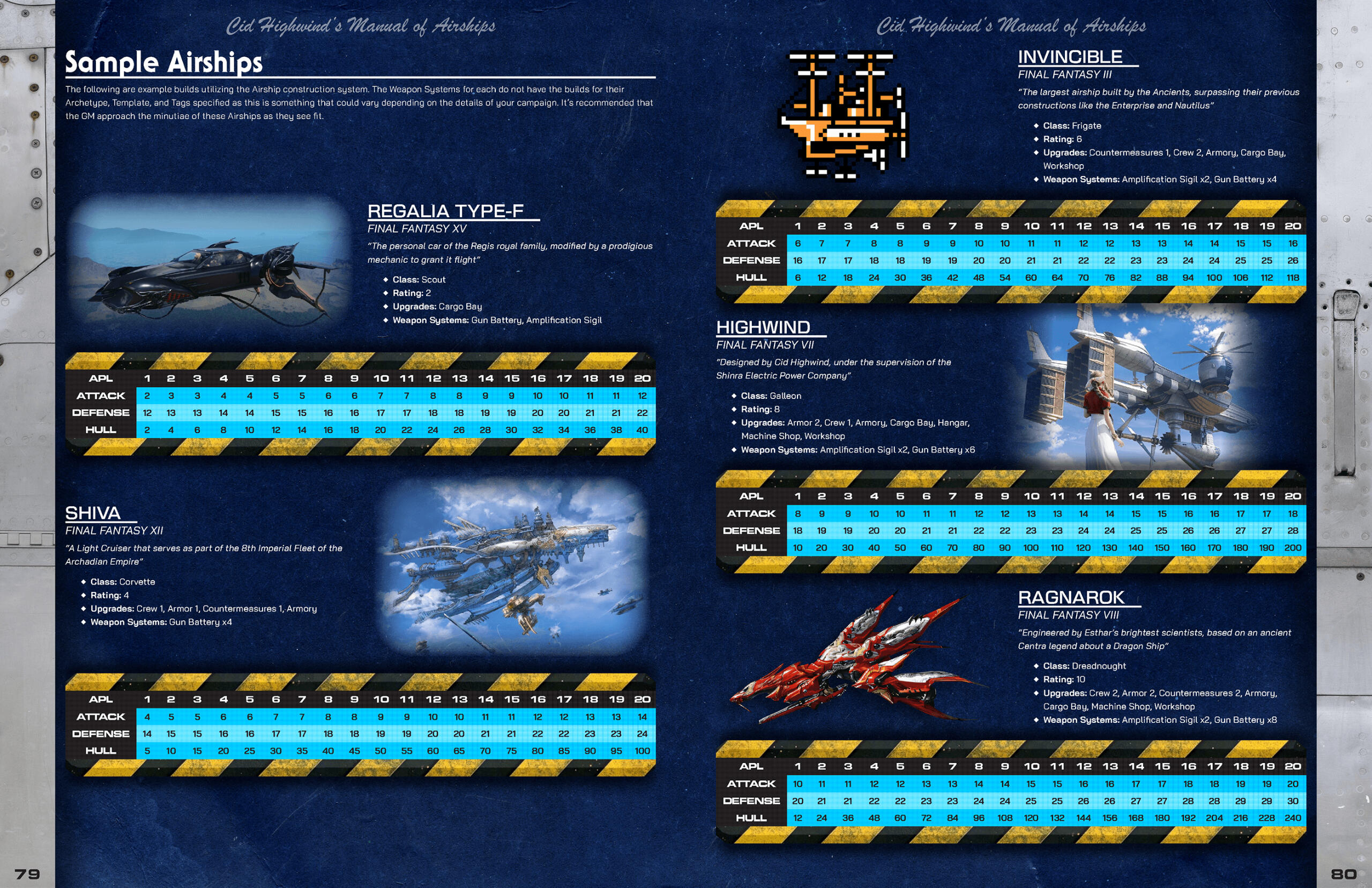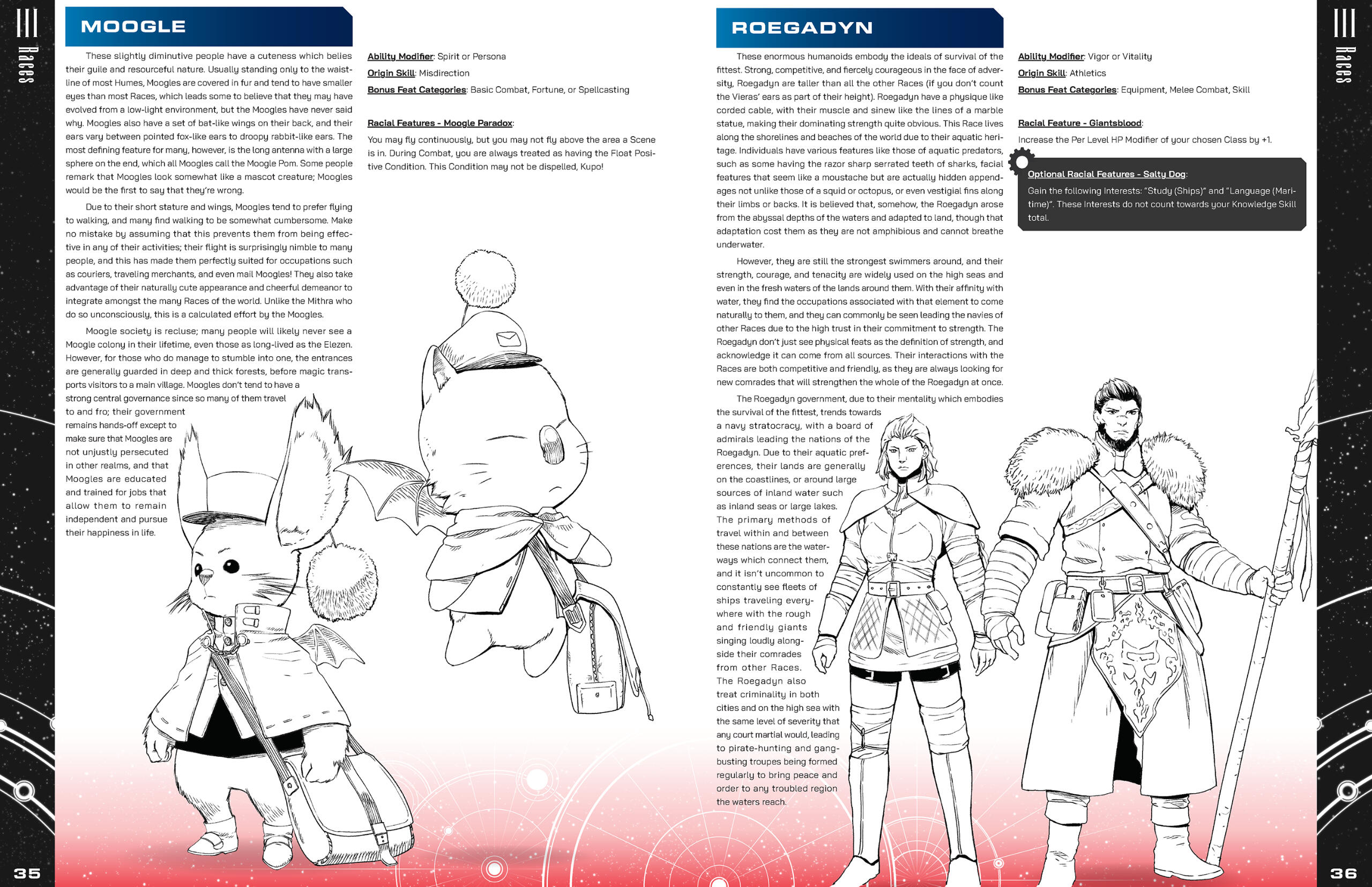 The Final Fantasy series has had a shockingly dense number of fan made tabletop roleplaying games made since the mid 90’s, each one bringing a unique perspective from their respective developers in an attempt to capture what they believe to be the spirit of the franchise. When Mildra approached me with his own spin on this time-honored tradition, I was instantly captivated by the desire to pull inspiration not only from one particular game, but every corner of the Final Fantasy series.Final Fantasy is an anthology series; every entry tells a different tale, each one set firmly in its own continuity. In order to craft a game that marries all of the series’ various ideas into one cohesive package, Mildra and his co-developer needed to take a setting agnostic approach. This mindset would serve as the basis for the design philosophy I would apply to the game’s visual identity; rather than pulling inspiration from game-specific elements (like menus and UI), I instead opted to point the book’s art direction towards the Japanese game manuals and art books (Ultimania).Naomi Hunter (NamiNomi) created the layout for the core book with this art direction in mind, and through consistent and efficient communication, we were able to establish a look for the game that both pays homage to the source material while also allowing the reader to imagine any hypothetical setting, whether it be an existing Final Fantasy world or one of their own creation.