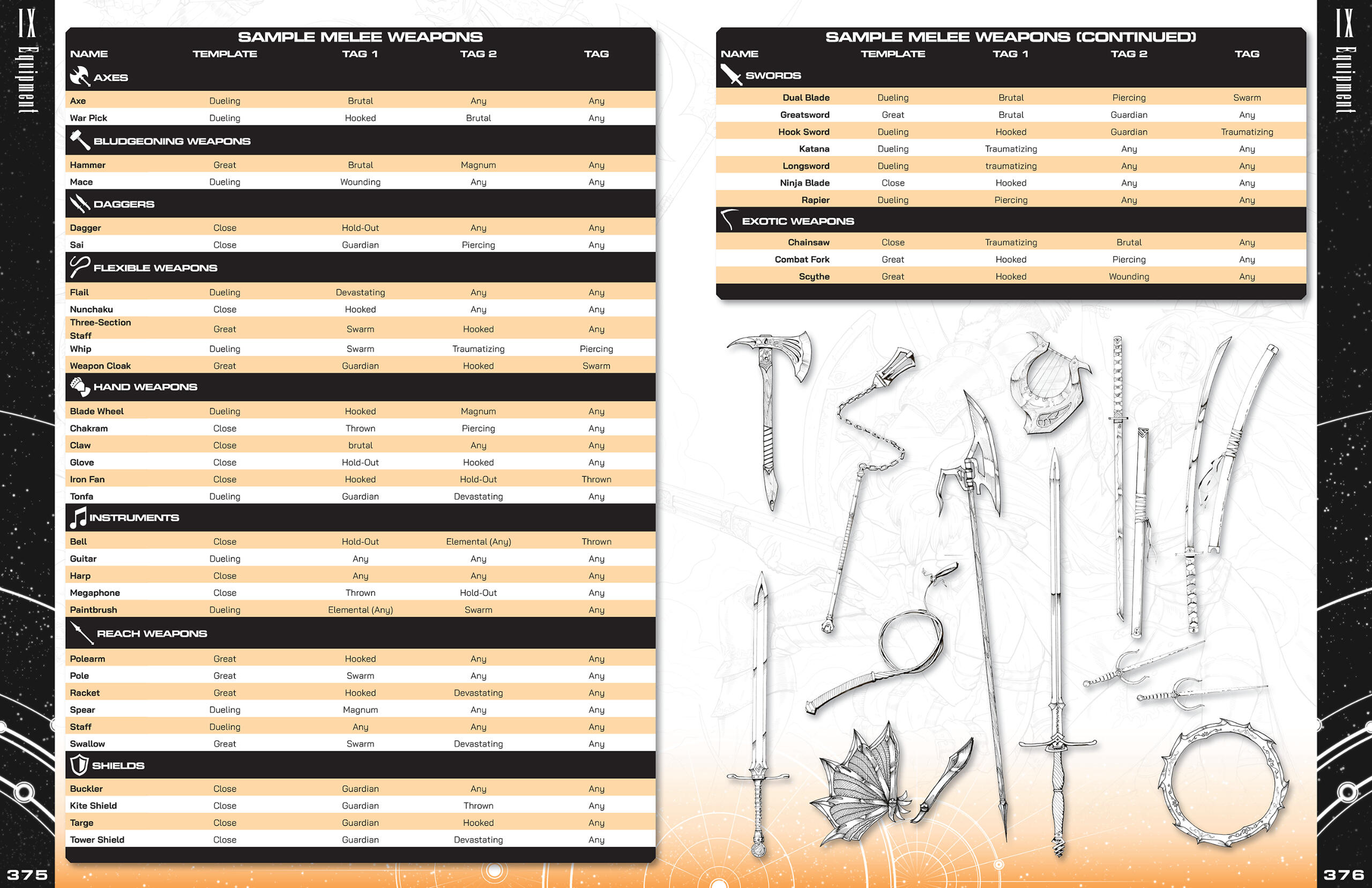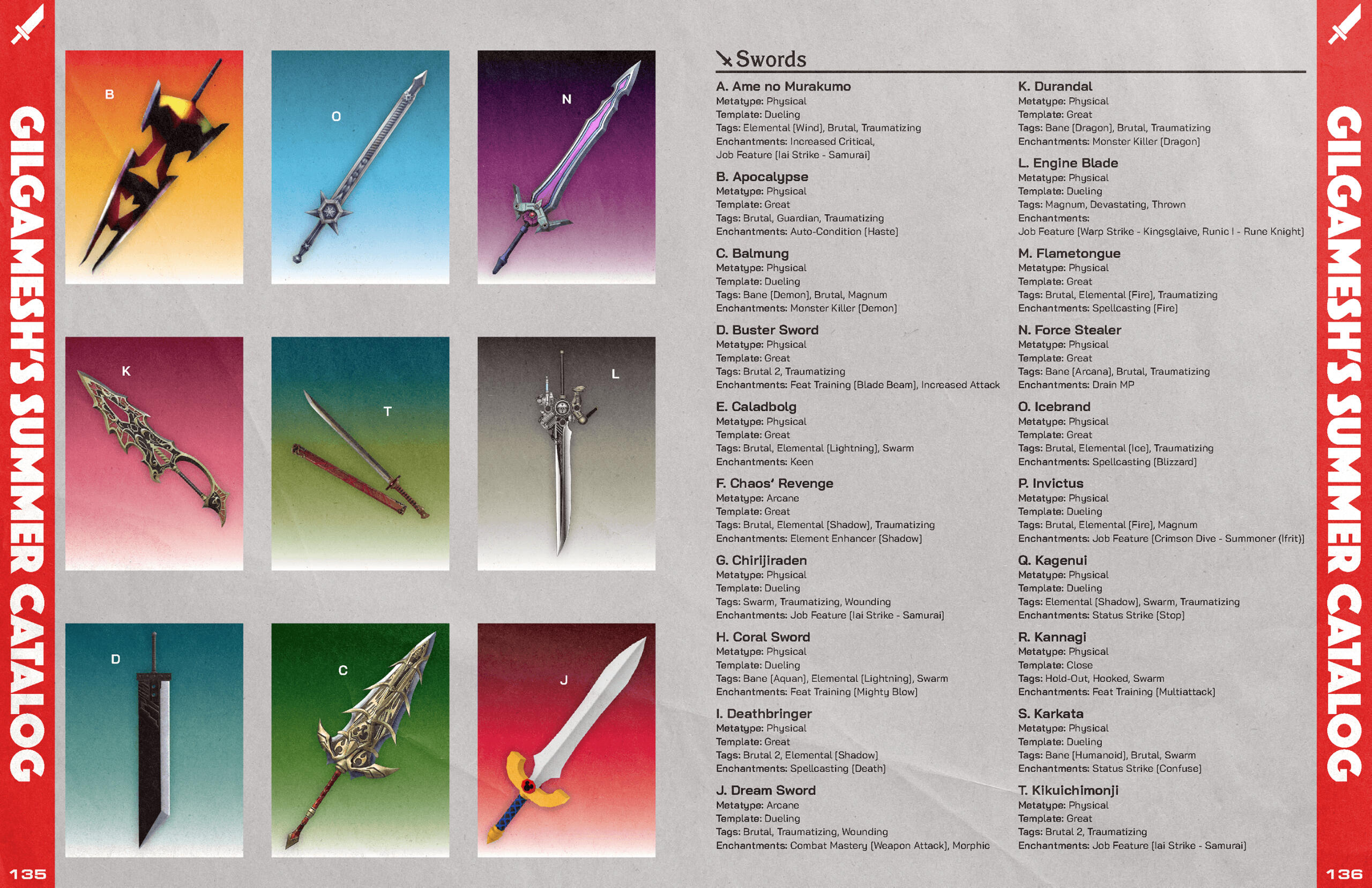 The greatest challenge and grandest undertaking of the project was the complete creation of the Ultimania, a 150+ page gameplay expansion for Legend Edition. Mildra had already written a vast majority of the document by the time I joined the project, and him and I shifted our full focus to it while Naomi was busy tackling the core book's layout. Due to her absence, I had to assume the responsibility of laying out the book (nearly in its entirety). The Ultimania presents it's content in themed chapters, and this presented the unique challenge of adapting the layout's art direction to reflect each chapter. Not only was this my first time creating a full-length book layout, but I also had to adapt the character and paragraph styles of the core book in order to maintain brand consistency between the two documents. However, what seemed like an insurmountably daunting task at first would quickly become one of the most fun projects I've ever had the pleasure of working on, each chapter presenting a new puzzle for me to solve in terms of how I would handle presentation, from creating tables that resemble mechanical screens to a chapter layout inspired by the department store catalogs of yesteryear.