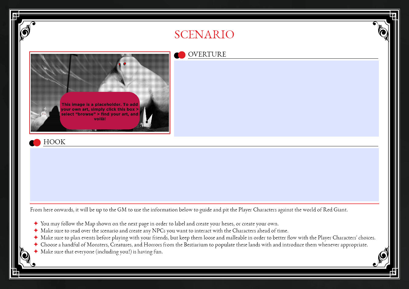 Following the full release of Cave of Monsters Games' Henshin! A Sentai RPG, I created an interactive "Do-it-yourself" template following the official format of the game's modules. Henshin's modules are concise; a cover page and a single interior page for details. Rookie Jet Studio's Cory Burns caught wind of this and requested a similar treatment for two of his titles: Over Arms & Red Giant. Both games are substantially more mechanically involved than Henshin, and thus required a complete layout overhaul to accommodate the customizable fields.