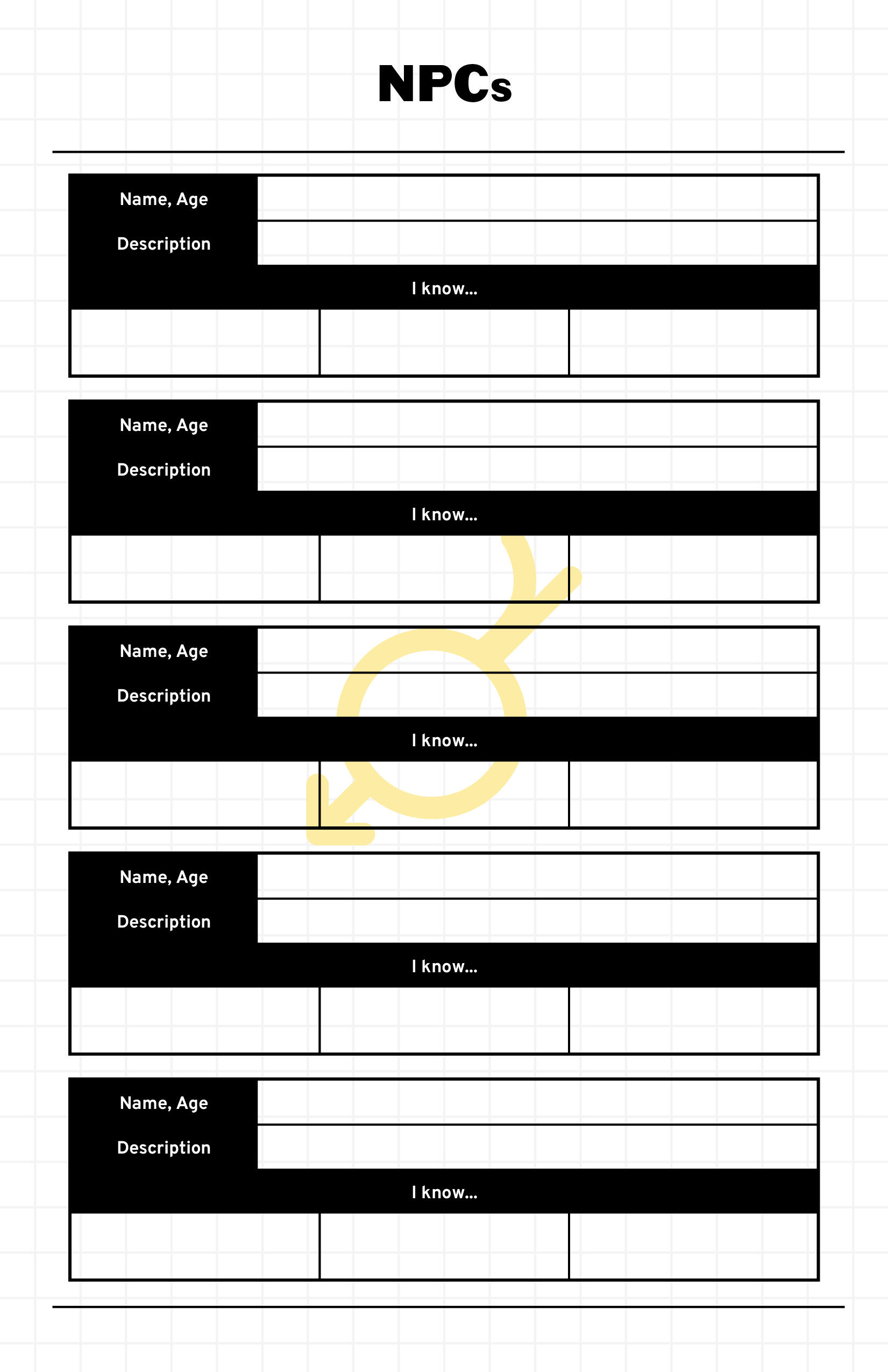 Another one of my responsibilities on the project was the creation of print-out character sheets and party trackers. To coincide with the agnostic approach of the book, I kept these relatively simple with a focus on practicality and ease of use. Spared usage of icons and colors helps to easily identify some of the most vital statistics on the sheet at a glance, and the formatted headers break up each section without breaking cohesion. This direction also allowed me to create the multitude of other sheets without much guesswork (there are a total of 9 pages in a single "Character Keeper", as well as 10+ add-on pages for optional rules; players build out a packet based on the needs of their characters and the rules of the current campaign). This ease of workflow was especially imperative when it came time to add the fill-in fields (seen in the right image), a process that only lasted 2 work sessions despite dealing with nearly 20 pages overall.