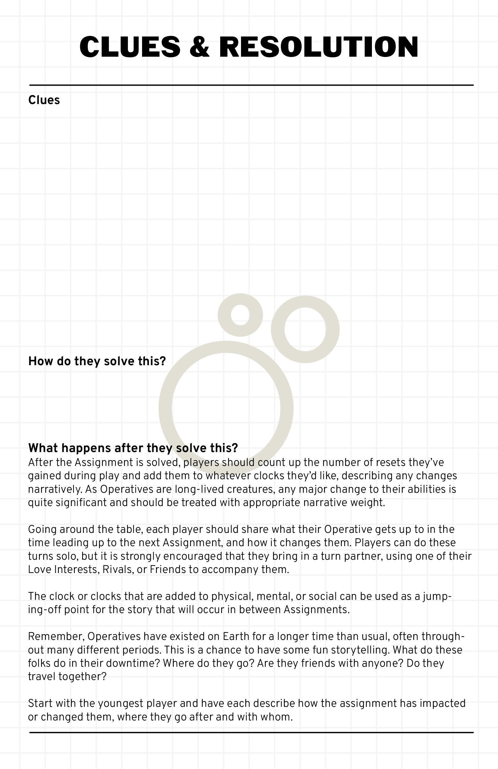 Rider Konchu is a tabletop roleplaying game inspired by the Kamen Rider series. Sam granted me creative liberty on the logo, only at the request that is isn't trying to replicate any existing Kamen Rider logos. This presented the challenge of creating something that captured the spirit of the source material without leaning too heavily on existing visual tropes; a unique perspective. I went with an angular font to reflect the action-packed nature of the game and it's inspirations, shearing it to an italicized shape to simulate a sense of motion. Stylizing the "O" as a gear perpetuates the game's primary gimmick (special items called "Gears") and plays into the technological and vehicular aspect of the source material. A faded hexagonal pattern evokes the imagery of tire tracks and the compound eyes of a grasshopper.Elements of Procedure provided a refreshing change of pace as it's source material was one I was not inherently familiar with. Another tabletop roleplaying, however this one is an investigation-centric title inspired by the British television series Sapphire & Steel. Similarly to Rider Konchu, Sam explicitly requested a departure from the source's logo design, instead focusing on the unique qualities of Elements of Procedure. This led to a relatively simple compromise; a simple typeface similar to those used in the book's layout with certain letters replaced by icons representing various features and core ideas from the game. Sometimes, less is more.In addition to the logo, I was also tasked with creating a custom Assignment Brief PDF, with fillable fields so players can easily create their own adventures within the format of the game. This was a wonderful opportunity to interact and work with the elegant layout style designed by the talented Jean Verne as I attempted to maintain a consistent look with the core rule book.