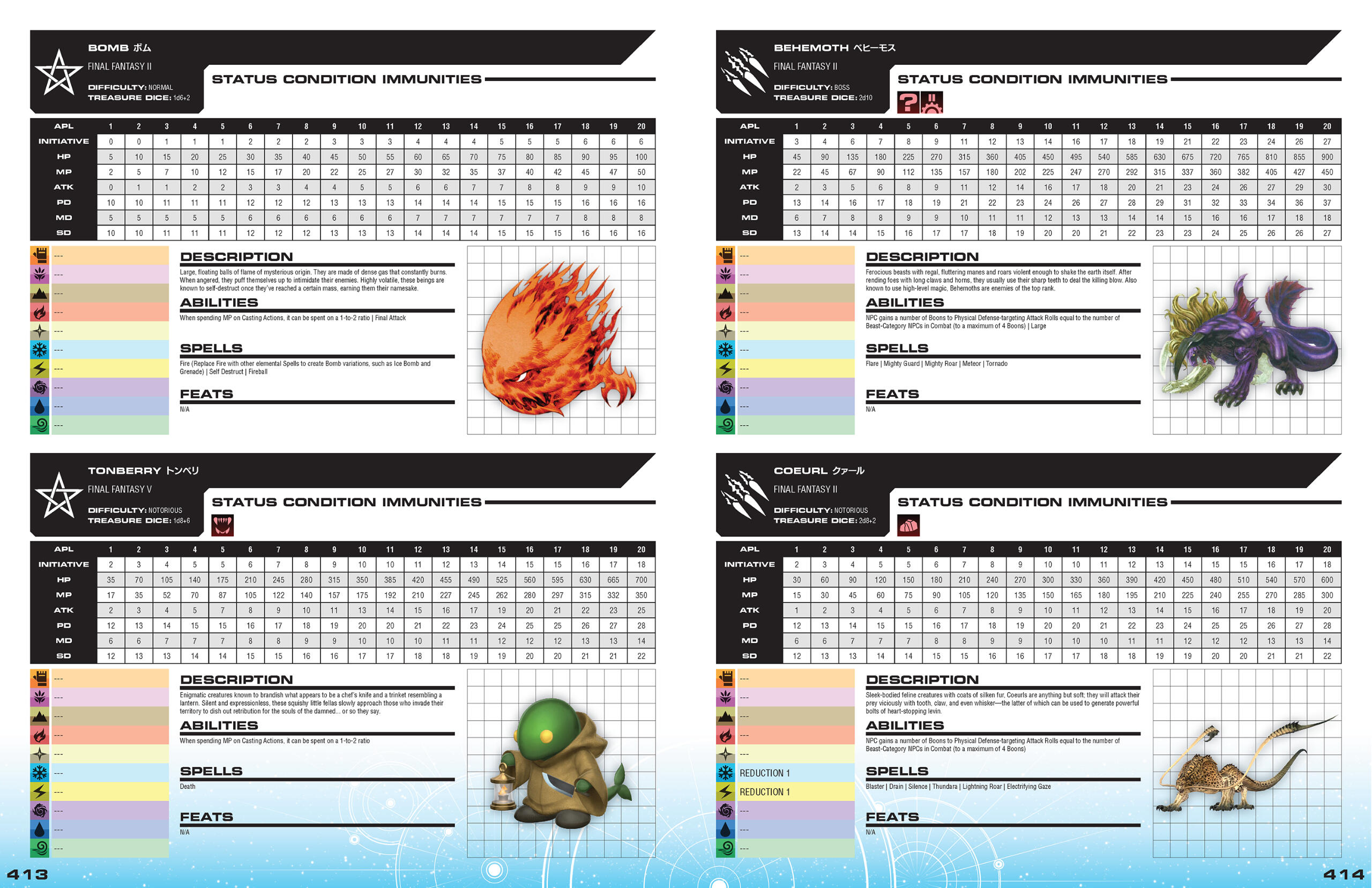 Legend Edition includes a fully detailed bestiary loaded with sample monsters from the series' history. Since laying it out was such a massive undertaking (and Naomi was already facing an overwhelming workload with the core book's layout), I offered to take the reigns on laying out the stat blocks for this section. Due to the sheer amount of stat blocks that were needed (25 in the core book, and a whopping 200 in the monster manual!), I opted to create a universal format that could accommodate each and every one of them. This arrangement is heavily inspired by console RPG strategy guides, like those for Pokémon, Shin Megami Tensei, and Final Fantasy itself. Approaching the bestiary in this manner allowed me to present all of the required information for each monster without over-cluttering the pages or needlessly increasing the overall page count of the book, while still leaving sufficient room for images and flavorful descriptions.